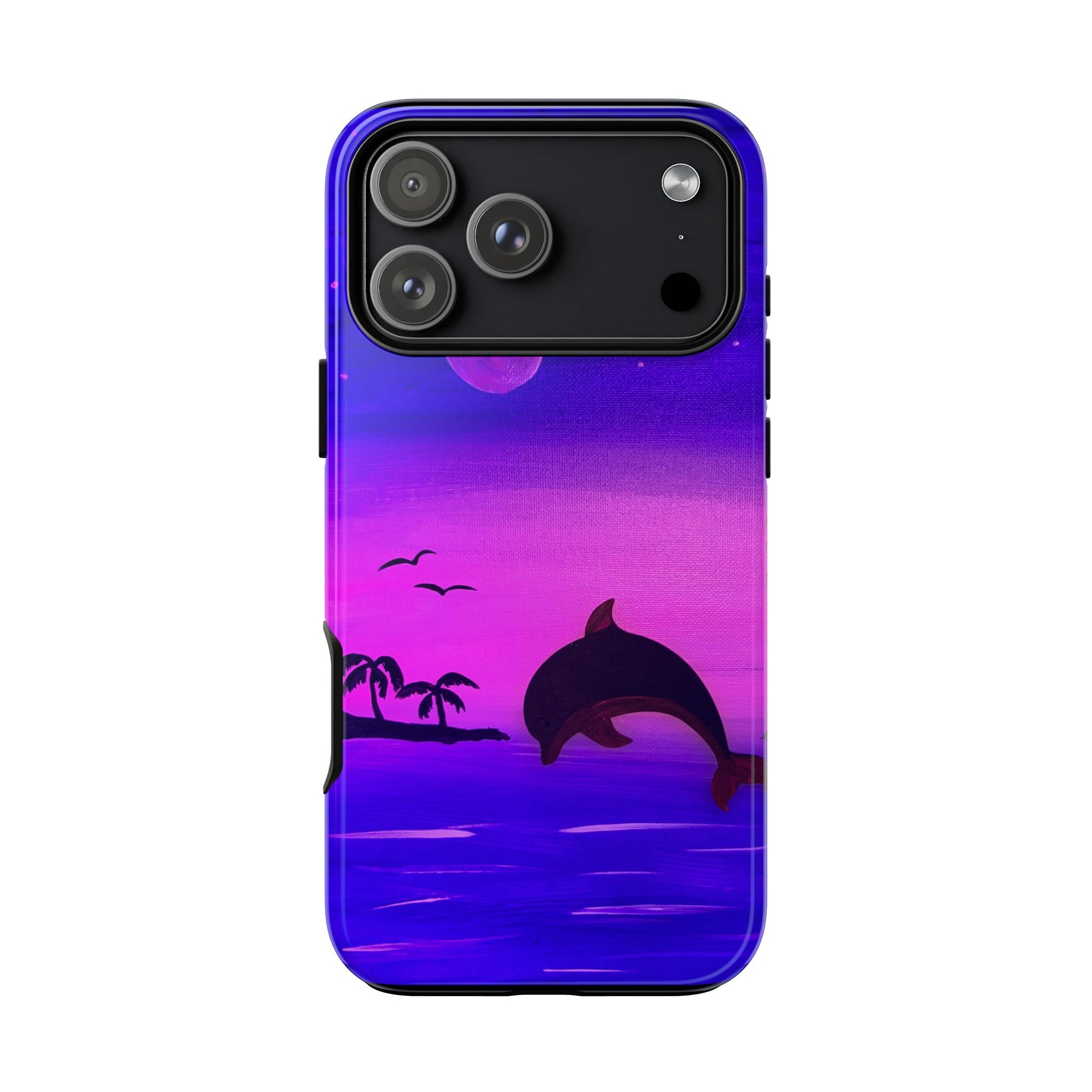 Carry a little nightly ocean with you. This protective phone case wraps a twilight scene around your device: a playful dolphin arcing above glassy water, distant palms, and a soft moonlit sky. The colors hold their brightness outdoors thanks to UV protection, while the dual-layer construction and silicone liner take the sting out of everyday drops. It’s a tactile, glossy or matte finish that reads like a pocket-sized escape — quiet, coastal, and a touch adventurous.